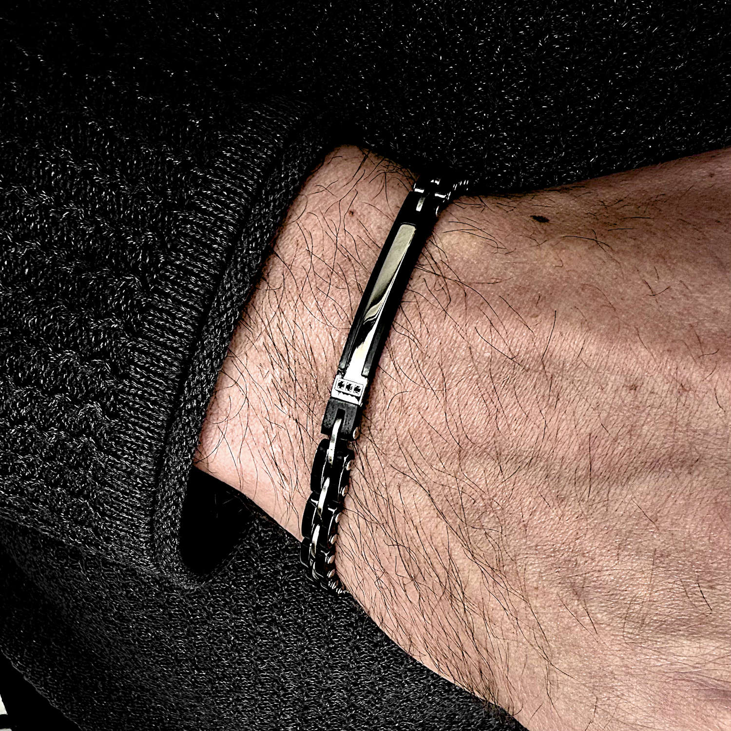 Men’s bracelet crafted from stainless steel, black ceramic, and zircon. Durable yet refined, with dual-tone detail and subtle sparkle. A modern accessory built to elevate your style from casual to formal.
